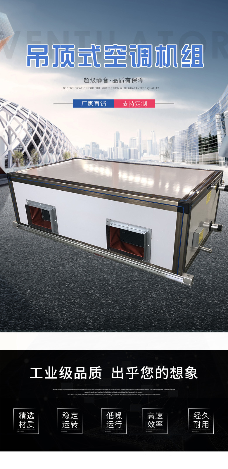 吊顶式空调机组,它是由混风段、过滤段、表冷段、加湿段、风机段组成,由冷冻水经蒸发器蒸发,通过风机进行换热转换而成。