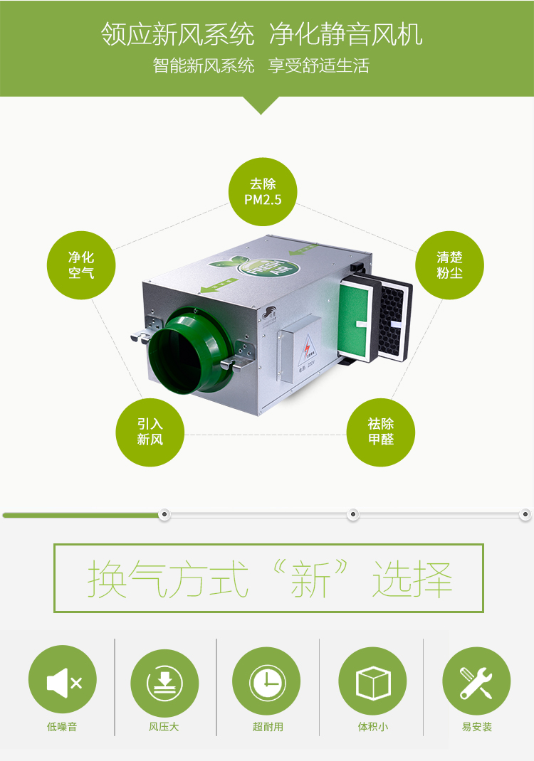 新风系统是根据在密闭的室内一侧用专用设备向室内送新风,再从另一侧由专用设备向室外排出,在室内会形成“新风流动场”,从而满足室内新风换气的需要。实施方案是:采用高风压、大流量风机、依靠机械强力由一侧向室内送风,由另一侧用专门设计的排风风机向室外排出的方式强迫在系统内形成新风流动场。在送风的同时对进入室内的空气进行过滤、消毒、杀菌、增氧、预热(冬天)。