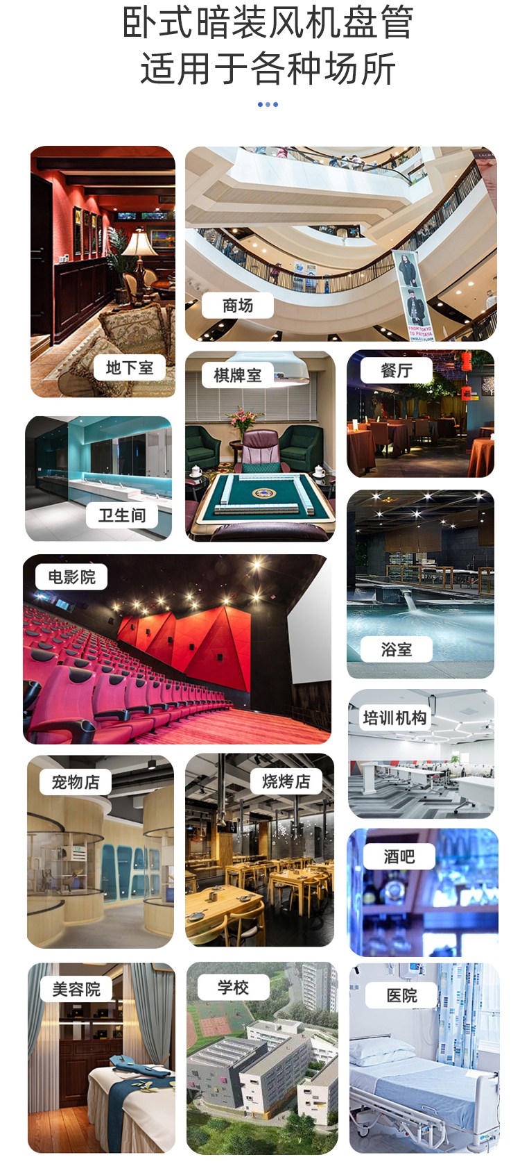2. 风机盘管机组送风量约为250~2500m/h,出口静压小于100pa(出口静压大于30pa为高静压型)。